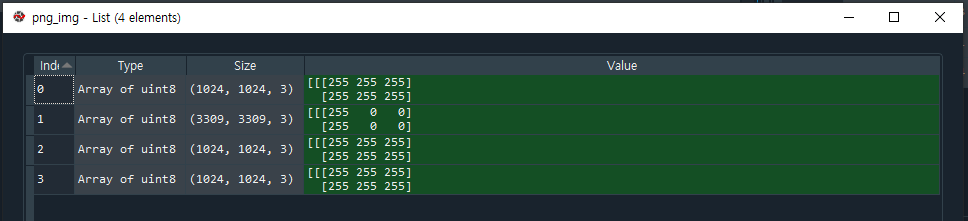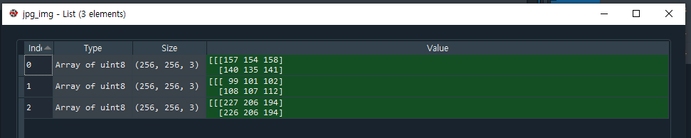 이렇게 실행해주면 png_img에는 .png 이미지 파일이, jpg_img에는 .jpg 이미지 파일이 numpy array 형태로 들어가게 된다.