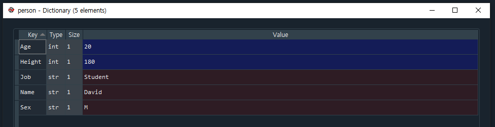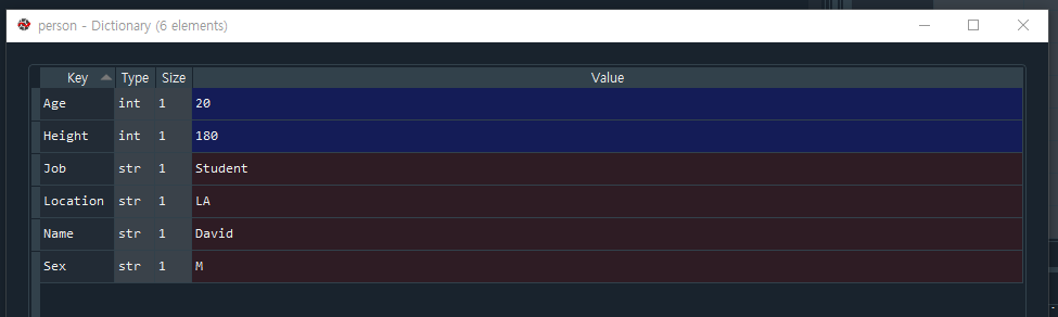 person = {'Name': 'David', 'Sex': 'M', 'Age': 20, 'Height': 180, 'Job': 'Student'}