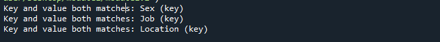 print(f"Key and value both matches: {k} (key)")