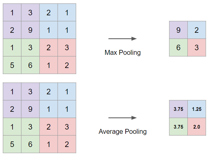 일반적으로 합성곱층(합성곱 연산 + 활성화 함수) 다음에는 풀링층을 추가한다. 풀링층에선느 피쳐맵을 다운샘플링하여 피쳐맵의 크기를 줄이는 풀링 연산이 이루어진다. 풀링 연산의 종류에는 최대 풀링(max pooling)과 평균 풀링(average pooling)이 있다. 풀링을 하는 이유는 과적합을 방지하기 위해서라고 한다. 다음 링크 참조: ufldl.stanford.edu/tutorial/supervised/Pooling/