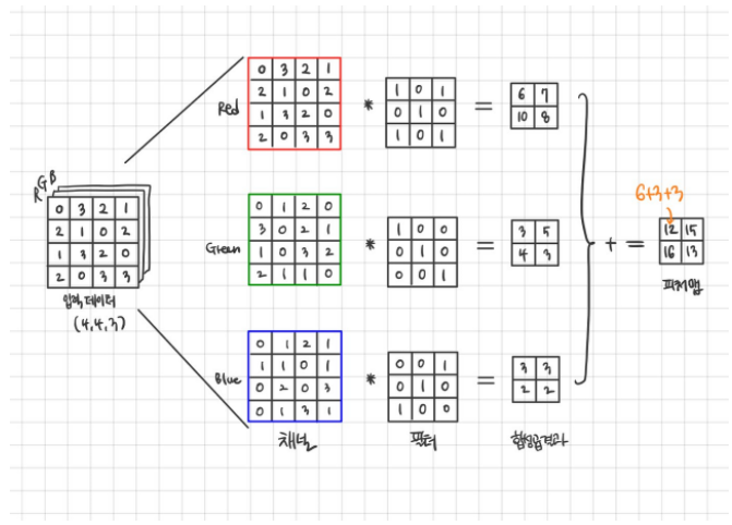 다수의 채널을 가질 때 합성곱 연산은 세개의 커널(채널)에 각각 합성곱 연산을 적용한 뒤에 얻은 결과 값을 같은 위치의 원소들끼리 더하기만 하면 (element-wise sum) 된다.