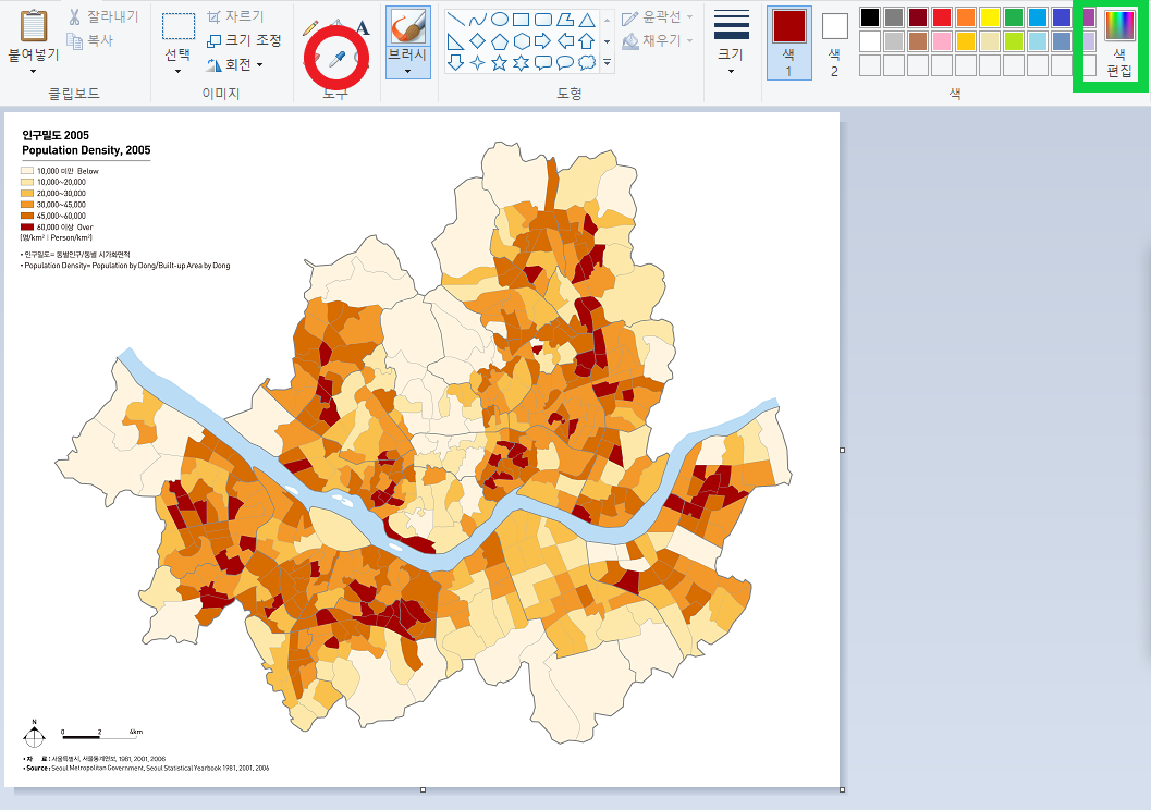 빨간색 동그라미는 '색 선택' 툴이다. (과학시간에 한번쯤 써봤을 스포이드 모양)