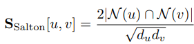 - Salton Index (cosine similarity): 위와 비슷하게 중첩 노드의 개수를 정량화하고 두 노드의 디그리로 나눠줌으로써 일반화하는 또 다른 계수이다.