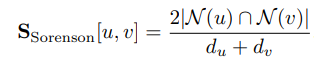 - Sørensen Index: 노드u와 노드v의 유사도는 (노드u와 노드v의 중첩 이웃 노드의 수)x2 / (노드u와 노드v의 디그리)이다. 노드 디그리로 나누어주는 것은 일종의 일반화인데, 이러한 일반화 계산이 중요한 이유는 'overlap measure would be highly biased towards predicting edges for nodes with large degrees' 라고 한다.