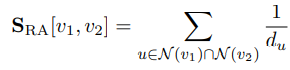 - Resource Allocation (RA) Index: 중첩 이웃노드의 갯수를 세고, 중첩 이웃노드의 중요도를 고려한 계수이다. RA 계수 같은 경우, u라는 v1과 v2의 중첩 이웃노드의 inverse degrees를 계산하였다.