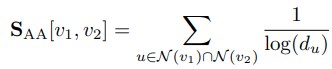 - Adamic/Adar Index: RA 계수와 비슷한데 log inverse degrees를 계산함. RA계수와 AA계수는 디그리가 낮은 중첩 이웃노드에 weight를 줬다. 요컨대 v1과 v2의 중첩 이웃노드 중 low-degree 이웃노드가 더 informative하단 intuition이다. 예를 들어 어떤 친구와 내가 공통적으로 알고 있는 친구A가 있는데, 이 친구A에게 우리 말고 다른 친구가 없을 경우 (low-degree)에 친구A가 우리에게 주는 정보가 더 많다는 뜻이다. 또 다른 공통 친구B는 우리 이외에도 다른 친구가 많다면 친구B가 알고 있는 정보들은 친구B의 다른 친구들에게 퍼져퍼져 나가 우리에게도 어쩌면 전해져 왔을 수 있지만.. 친구A 같은 경우, 친구A의 친구가 우리밖에 없기 때문에 친구A가 주는 정보는 유니크하고, 더 귀한 정보일 것이다. 뭐, 난 이렇게 이해했다.