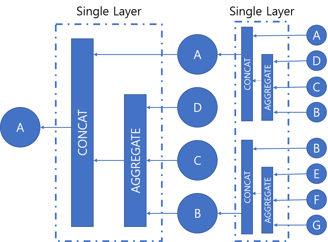 - CONCAT과 헷갈리지 말자! CONCAT은 AGGREGATE된 이웃들의 정보와 나 자신의 정보를 합치는 작업을 하는 것이고, AGGREGATE은 내 이웃들의 정보만! 합치는 것이다.