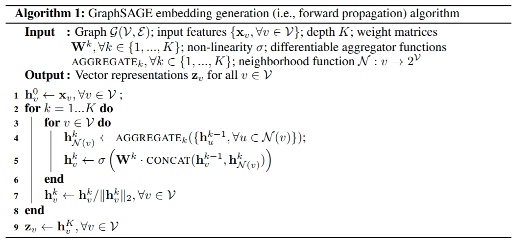 - [2 - 6] 그 다음 레이어부터는 모든 노드 v에 대하여 주변 노드의 정보를 AGGREGATE하고 (이것은 이웃들에 대한 정보) 나 자신의 정보를 CONCAT한 후에 weight matrix를 곱해준다. 그리고 이 결과를 non-linear function에 입력하여 나온 출력이 해당 노드의 feature로 업데이트 해준다.