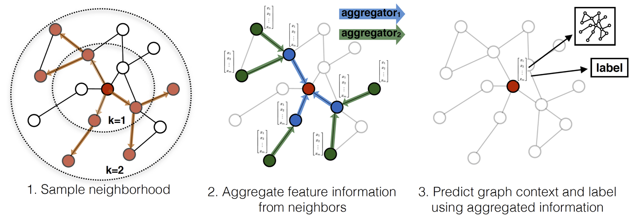 - SAmple and aggregaTE를 결합해 네이밍 한 네트워크인 만큼 이웃 노드를 샘플링하고, aggregating하는 것이 이 네트워크의 핵심이다.