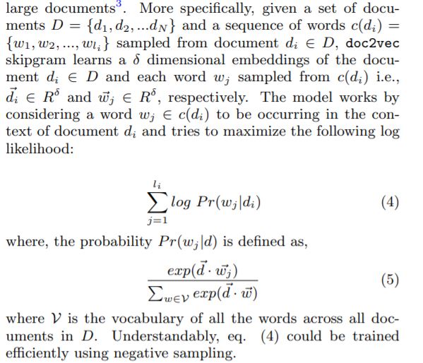 doc2vec은 어떤 문단 d를 어떻게 임베딩할 것인가에 대한 함수이다. 어떤 문단 d는 d를 이루고 있는 w의 sequence로 나타낼 수 있다. 그리고 이를 임베딩하는 skipgram model은 (4)수식을 maximize하는 방향으로 학습한다.