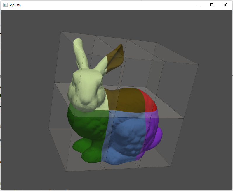 하지만 이번은 단순히 어떻게 분할되는지 결과 확인 목적이기 때문에 비교적 실행속도가 빠른 pyvista를 사용해도 괜찮을 것 같다.