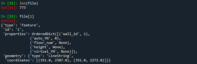 file에는 총 773개의 무언가가 들어있고, 랜덤한 인덱스를 넣어보면 file[1]이라는 객체는 'type', 'id', 'properties', 'geometry' 라는 key값을 갖는 dict인 것을 알 수 있다.