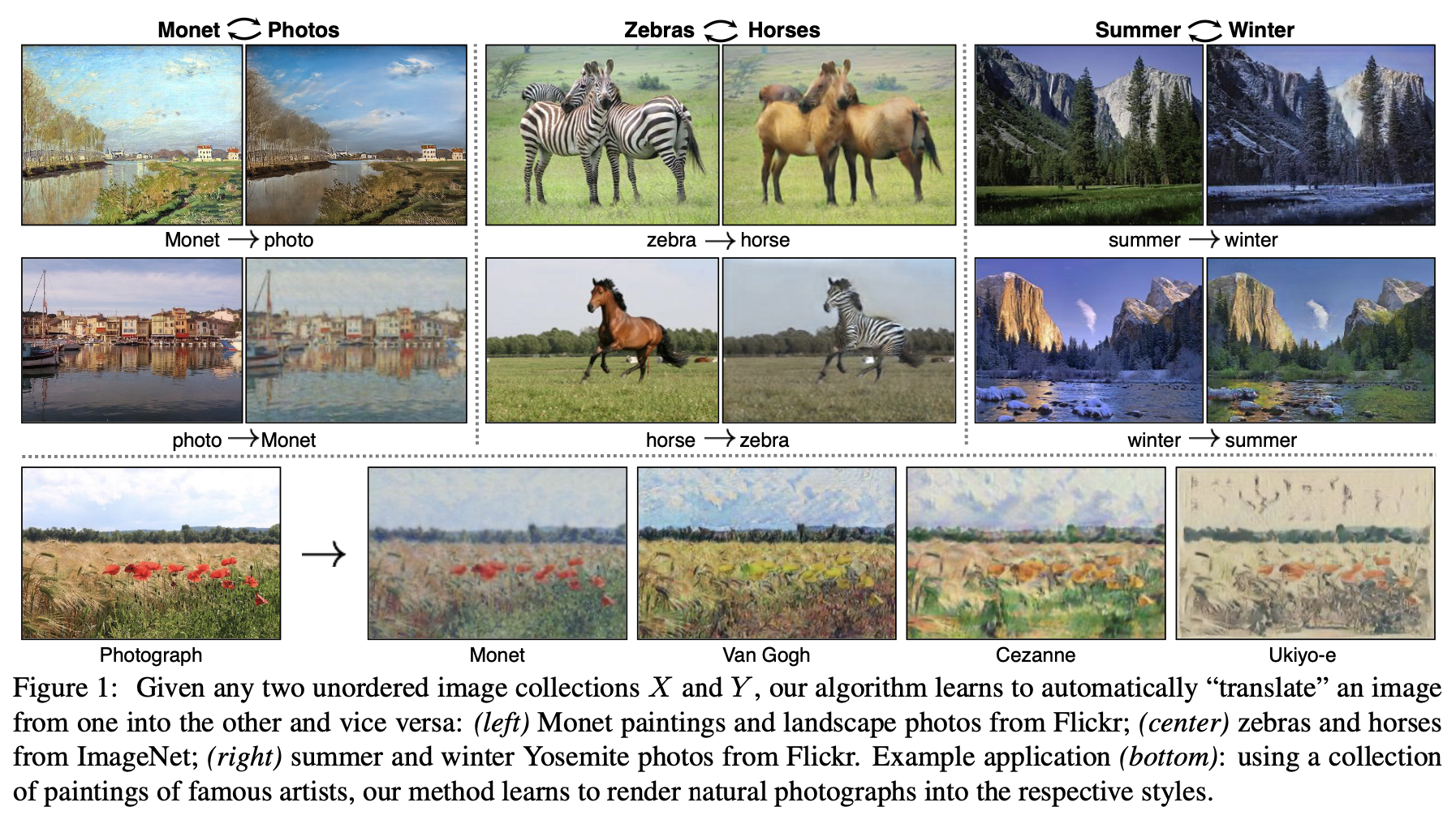 Image-to-Image translation은 paired image 세트를 사용해서 입력이미지와 출력이미지를 매핑하는 것을 목표로 한다. 얼룩말을 일반 말로, 모네의 그림을 사진처럼, 사진을 모네가 그린 그림처럼 바꾸는 것이다.